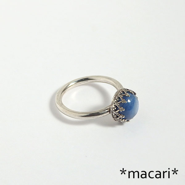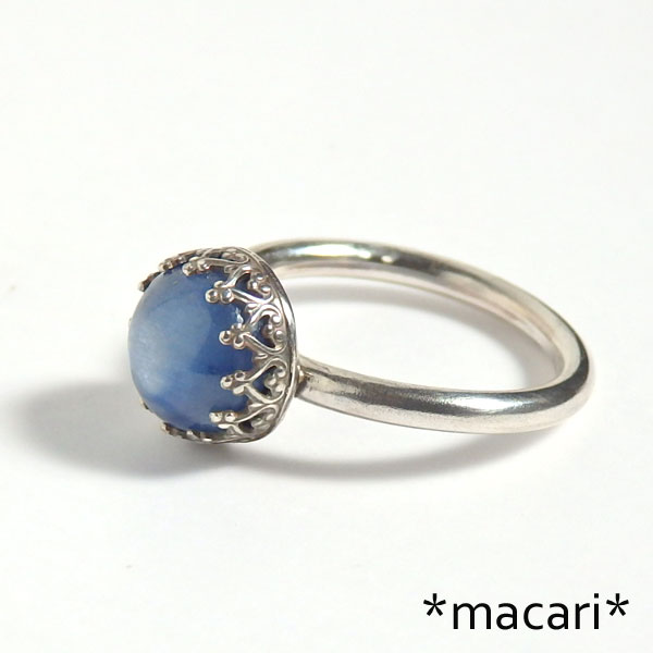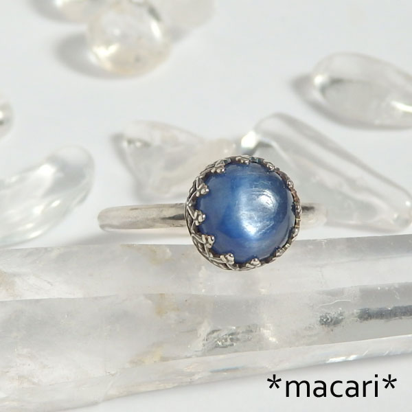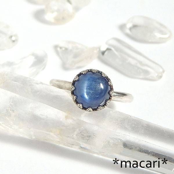 カイヤナイトの飾り枠リング 真ん丸のカイヤナイトのカボションを飾り枠で留めたシンプルなリングです。 丸線でアームを作っているので、指あたりが良いですよ。^^ こちらのカイヤナイトは角度によってキャッツアイのような光のラインが浮かび上がります。 *枠部分に立体感を出すため燻加工をしてあります。 *カイヤナイト* 棒状や板状の結晶で産出するアルミニウム珪酸塩鉱物。 |