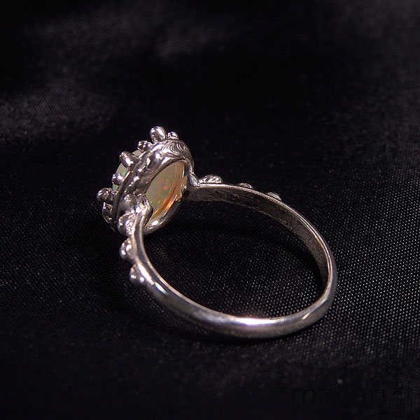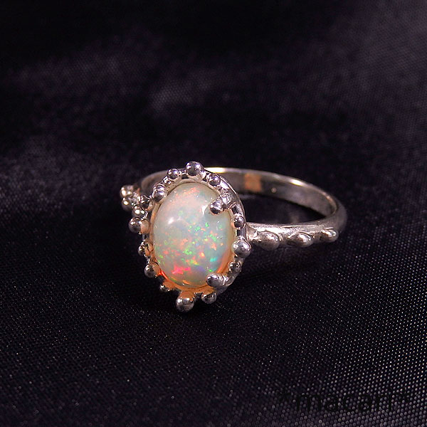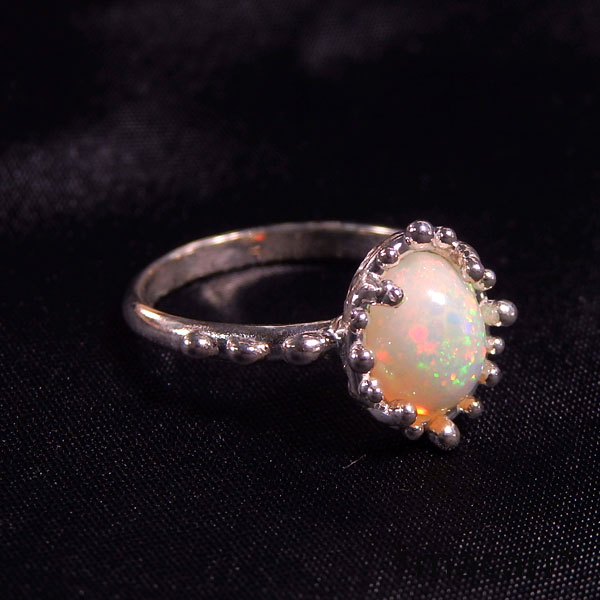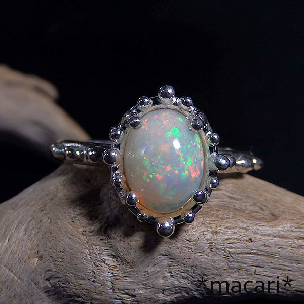 細かな遊色がさざめくように輝くエチオピアオパールを 石枠に粒飾りをあしらったリングに仕上げました。 手の動きに合わせて、キラキラと幻想的な色合いが浮かび上がります。 直射日光ですと、さらに鮮やかな輝きがご覧いただけますよ。 *エチオピアオパール* 近年多く出回るようになったエチオピア産の遊色が強く浮かぶオパールです。 画像のようなホワイトの他にオレンジ、チョコレートカラーなど様々な色合いのものが見られます。 ハイドロフェーンという水分を吸収して透明になるタイプがあります。 こちらは試していないので分かりませんが、なるべく水道水などには触れさせないようにご注意ください。 *塩素が影響して黄ばむ場合があります。 水につけてみたい方は薬局などで販売している精製水をご使用ください