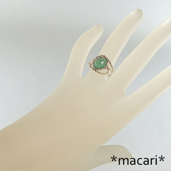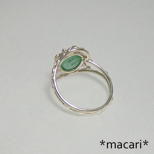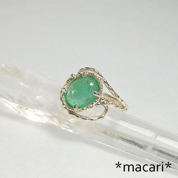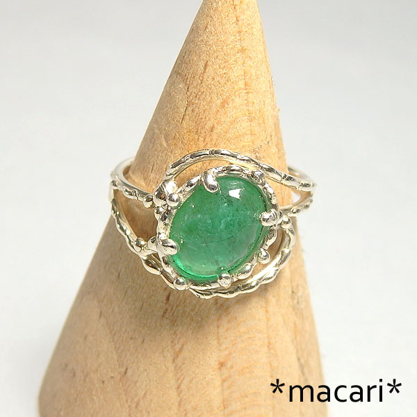 エメラルドの粒飾りリング ほんのり透明感のあるエメラルドカボションを 粒飾りのリングに仕上げました。 アームは曲線を生かしたデザインで、鮮やかなエメラルドの色合いに銀の優しい光がマッチした個性的なリングです。 エメラルドというと大変高価な宝石ですが、こちらはインクルージョンやクラックが目立つため *エメラルド* |