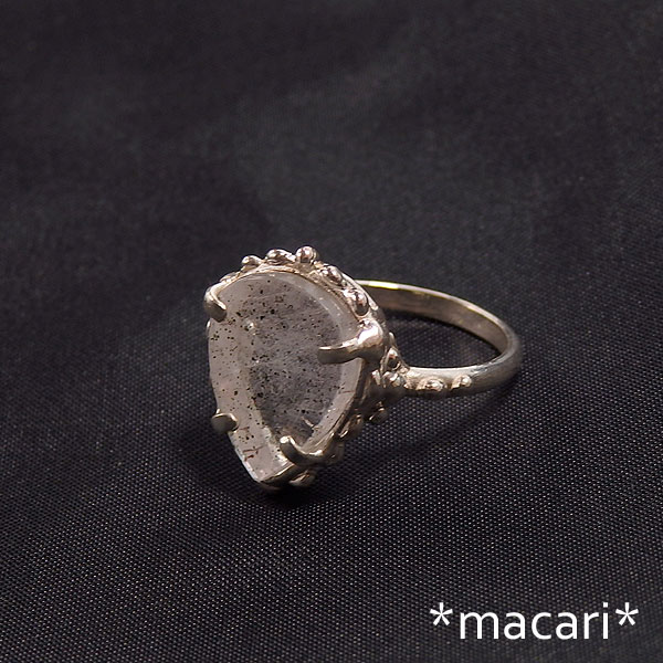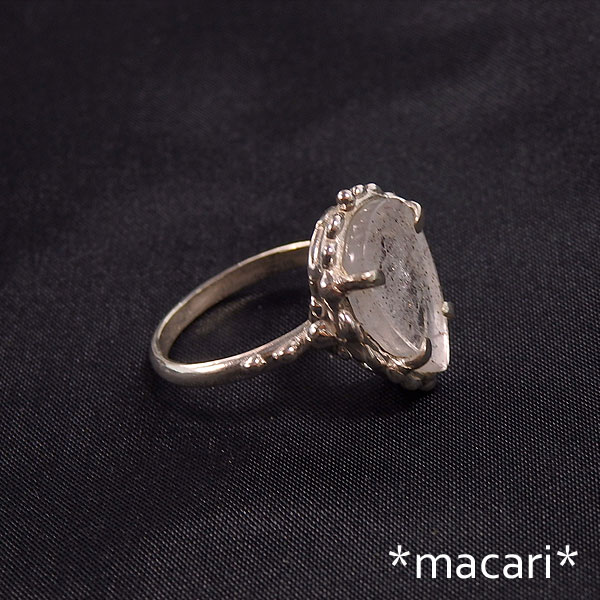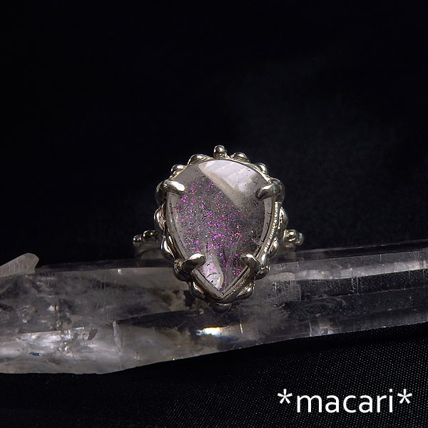 ピンクファイアークォーツのリング マゼンダピンクの輝きが美しいピンクファイアークォーツを石枠にテクスチャをつけたリングに仕上げました。 *ピンクファイアークォーツ* 水晶の中に小さな六角形の板状インクルージョン(内包物)があり、 こちらはインクルージョンが多く入っていますので、角度によってバシッとピンク色の輝きが浮かび上がりますよ! 水晶のインクルージョンはコーベライトと言われていましたが、どうも実際はヘマタイトのようです。 どのような条件でヘマタイトがインクルージョンされるとこのような現象が起こるのかはわかりませんが、 とても幻想的で美しい輝き! 別名ティンカーベル・クォーツとも呼ばれます。 物語に出てくる妖精の粉を散りばめたかのような不思議な雰囲気の石ですよ。 *小さなクラックが見られますので、ご了承ください。(右部分) |