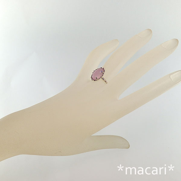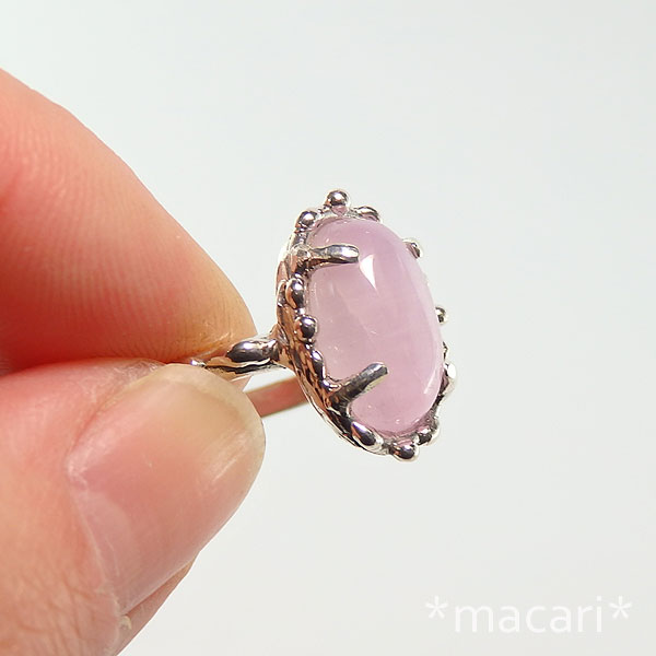 クンツァイトの粒飾りリング 可愛らしいピンク色のナイジェリア産クンツァイトルースを 粒飾りのリングに仕上げました。 透明感はありませんが、角度によってシラーが現れる美しいクンツァイトです。 *表面に小さな溝と側面にうっすらクラック状のライン見られますので、ご了承ください。